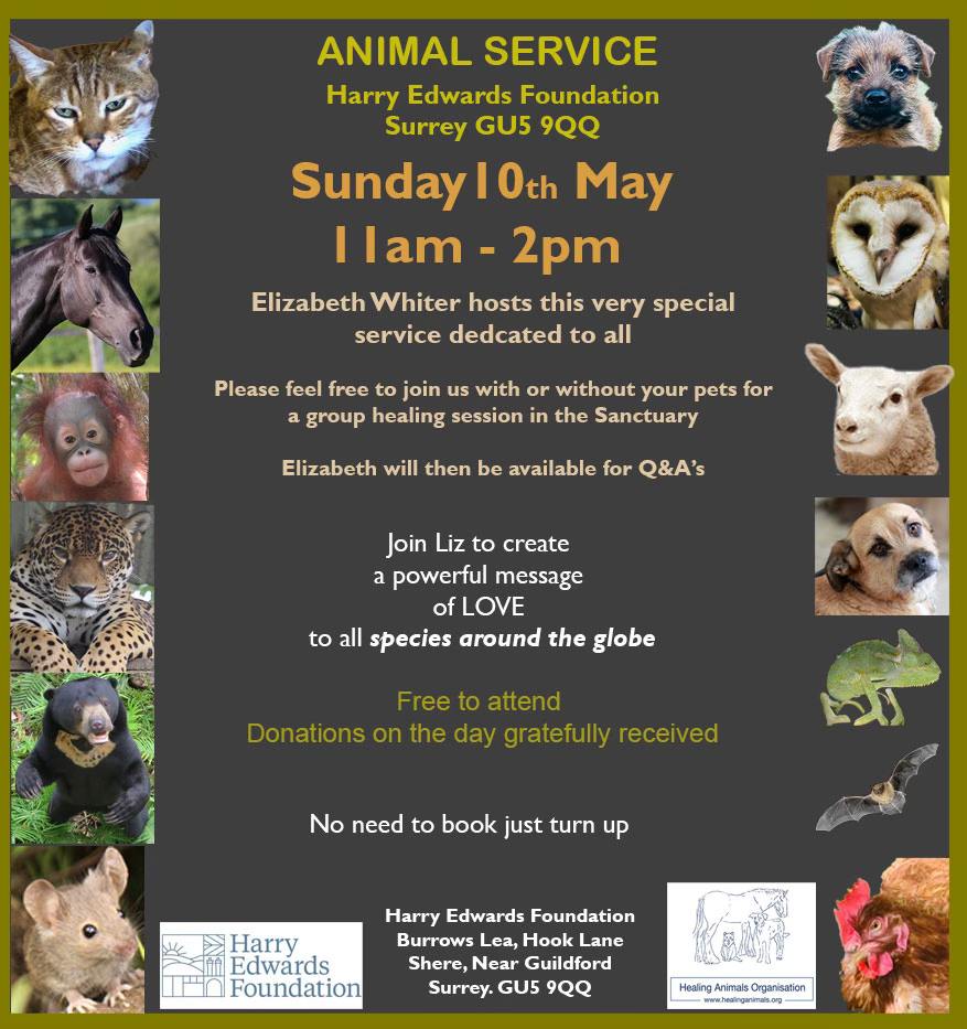 Elizabeth Whiter hosts this very special service dedicated to all animals. Please feel free to join us with or without your pets for a group healing in the Sanctuary. Elizabeth will then be available for Q & As afterwards.